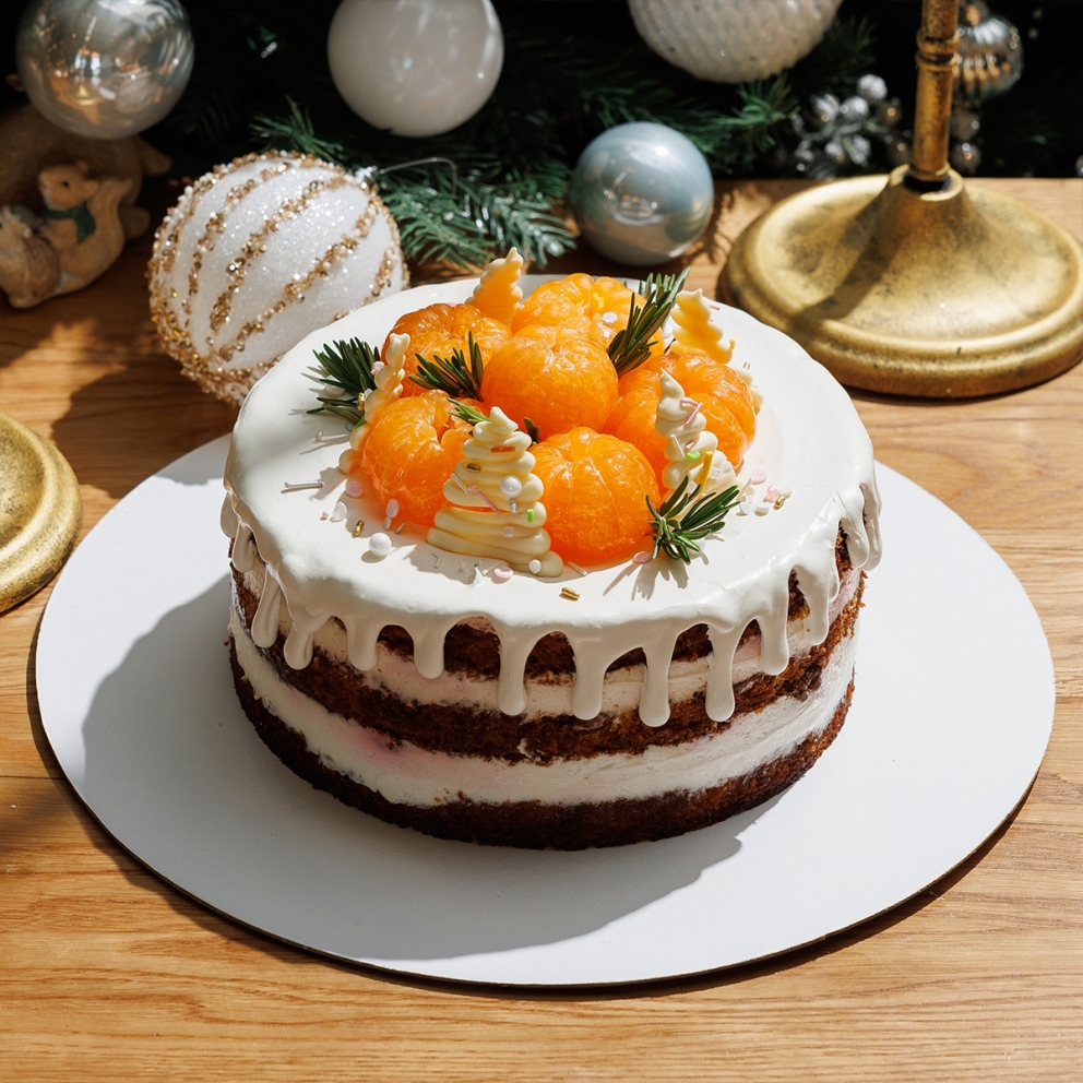 Бисквит с морковно-мандариновым кремом, белым шоколадом, свежими мандаринами и розмарином