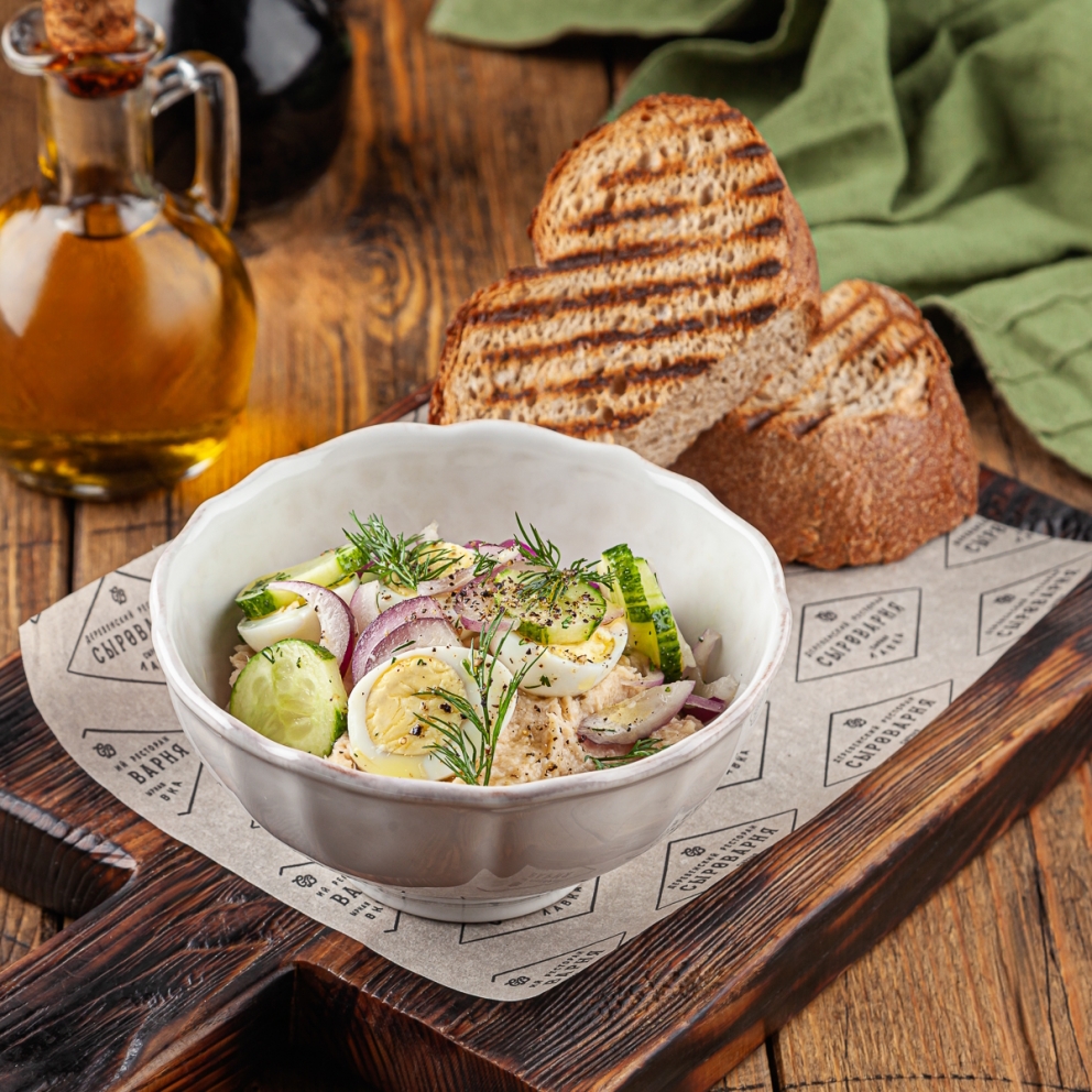 Форшмак (сельдь бочковая филе, яйцо куриное, мусс (сыр рикотта, сливки 33%, масло оливковое, соль морская, перец черный), масло подсолнечное рафинированное, лук красный, гренки (хлеб белый (пшеничный), масло чесночное (масло подсолнечное, чеснок), орегано, соль морская), сок лимона, перец горошек молотый), хлеб ржано-пшеничный, яйцо перепелиное отварное, лук красный маринованный (лук красный крымский, уксус столовый, зелень укроп, сахар, соль морская), огурцы люкс, укроп, масло оливковое, масло