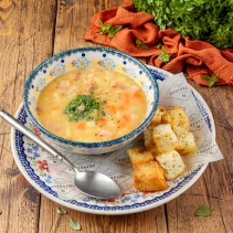 Ароматный гороховый суп с копченостями и хрустящими чесночными гренками