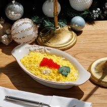 Мимоза с лососем, неркой, овощами, яйцом и красной икрой