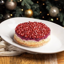 Праздничный салат из отварных овощей, сочной курицы и яиц. Украшен зернами граната