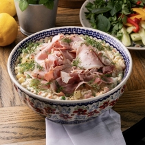Салат оливье из отварного картофеля, куриного яйца, отварной моркови и соленых огурцов с тамбовским окороком и молодым зеленым горошком