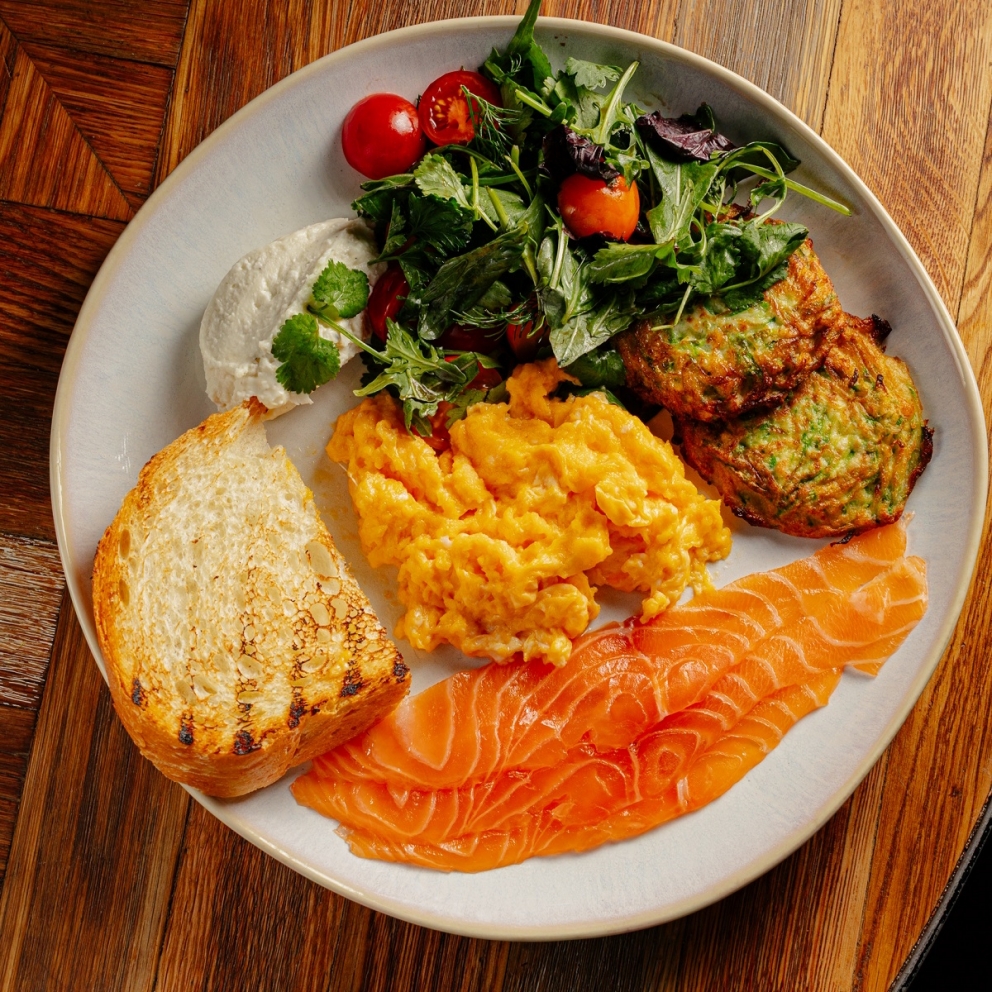 Лосось с/с, скрембл (2 яйца, сливочное масло), томаты черри, замешанные с солью и бальзамическим кремом, руккола, микс зелени, белый хлеб, оладьи из кабачков (яйцо, мука, соль, масло растительное), мусс из рикотты (рикотта, сливки, масло оливковое, соль, перец), оливковое масло