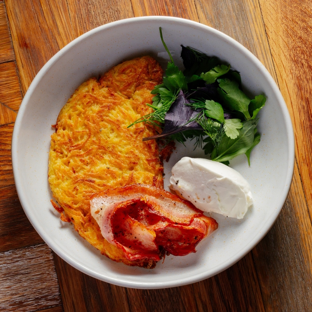 Драник (картофель, мука, яйцо куриное, соль, растительное масло), бекон обжаренный, сметана с солью, микс зелени, черный перец