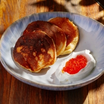 Оладьи (мука, молоко, разрыхлитель, яйцо куриное, морская соль, сахар), масло растительное, сметана с солью, красная икра