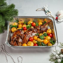 Томленая лопатка ягненка с гарниром из печеного мини-картофеля, обжаренного красного лука, помидоров черри