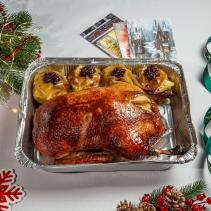 Утка целая, яблоки зеленые, изюм, корица, апельсиновый фреш, соус из брусники, специи
