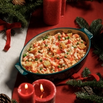 Салат оливье из отварного картофеля, моркови, молодого горошка и куриного яйца с добавлением раковых шеек и камчатского краба