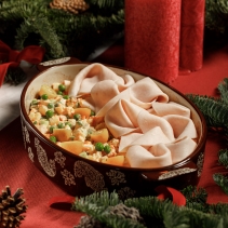 Картофель, морковь, горошек, огурец соленый, майонез, кумкват, докторская колбаса
