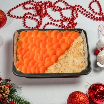 Тесто слоеное (вода, соль морская, сливочное масло, мука в/с, маргарин, кислота лимонная), крем (молоко, сахар песок, молоко сгущенное, мука в/с, крахмал кукурузный, масло сливочное, сливки, ванилин), мандарин, гель нейтральный