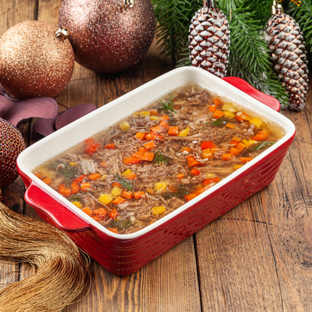 Бульон говяжий (говяжьи кости, морковь, лук репчатый, чеснок, соль морская, перец черный горошек, лавровый лист), говядина грудинка томленая (говядина лопатка зачищенная, соль морская, тимьян свежий, розмарин свежий, лавровый лист, перец горошек молотый), перец болгарский запеченный, морковь отварная, желатин листовой говяжий, соль морская, чеснок, укроп