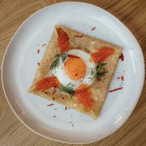 Нежный блинчик с красной икрой, глазуньей, сыром Страчателла и кремом из сыра Рикотта