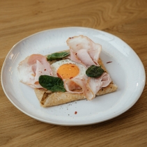 Нежный блинчик с тамбовским окороком, глазуньей, сыром Страчателла и кремом из сыра Рикотта