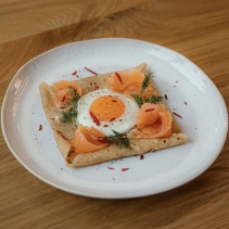 Нежный блинчик со слабосоленым лососем, глазуньей, сыром Страчателла и кремом из сыра Рикотта