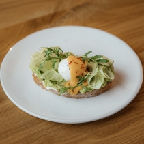 Белый хлеб, масло сливочное, мусс из рикотты (рикотта, сливки 33%, масло оливковое, соль морская, перец черный молотый), мусс из авокадо (авокадо, масло оливковое, соль морская, перец черный молотый, фреш лимона), яйцо куриное, огурец свежий, соус голландез (яйцо куриное, масло сливочное, соус крем-бальзамик, соль морская, куркума), рукола, томаты сушеные