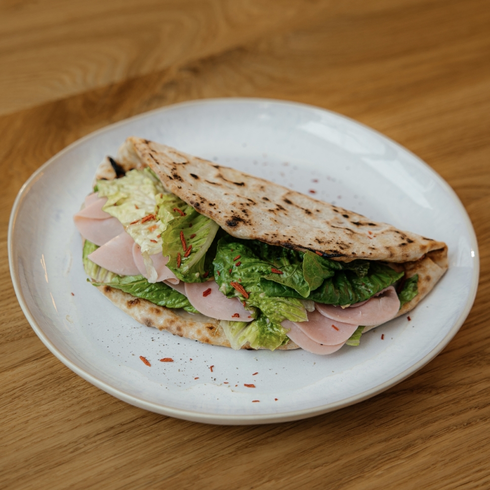 Итальянский сэндвич с расплавленным сыром Моцарелла, авокадо, томатами, листьями салата романо, домашней Страчателлой, соусом и ветчиной из индейки