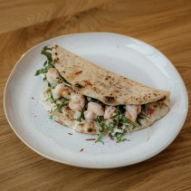 Тесто для пиццы (дрожжи живые, вода, соль морская, масло оливковое, мука фарино росса), сыр моцарелла, авокадо, помидоры узбекские, масло оливковое, соль морская, перец черный молотый, салат романо, сыр страчателла, креветки, соус сладкий чили, сливки, томаты сушеные