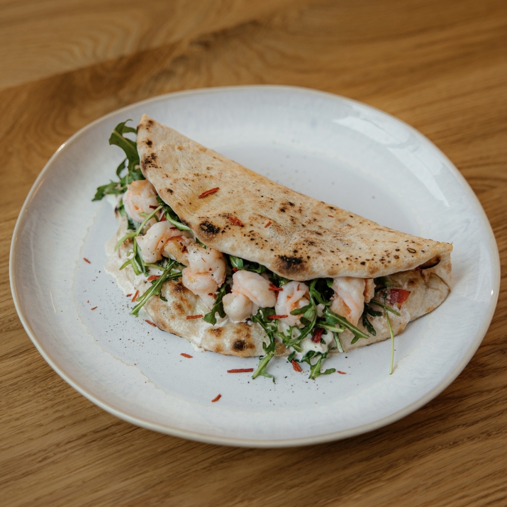 Итальянский сэндвич с расплавленным сыром Моцарелла, авокадо, томатами, листьями салата романо, домашней Страчателлой, соусом и креветками