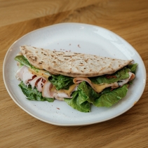 Итальянский сэндвич с расплавленным сыром Моцарелла, авокадо, томатами, листьями салата романо, домашней Страчателлой, соусом и тамбовским окороком