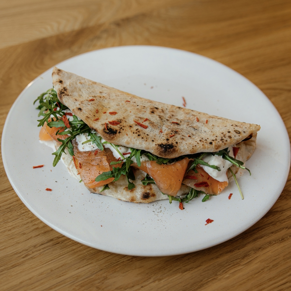 Итальянский сэндвич с расплавленным сыром Моцарелла, авокадо, томатами, листьями салата романо, домашней Страчателлой, соусом и слабосоленым лососем
