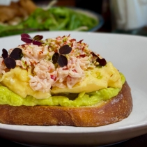 Хлеб бриошь (сахар, масло сливочное, яйцо, соль, мука пшеничная, дрожжи, вода), мясо снежного краба, авокадо, яйцо, соус руй, томаты сушеные, микрозелень
