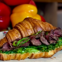 Круассан с ростбифом, сыром и вялеными томатами с соусом песто