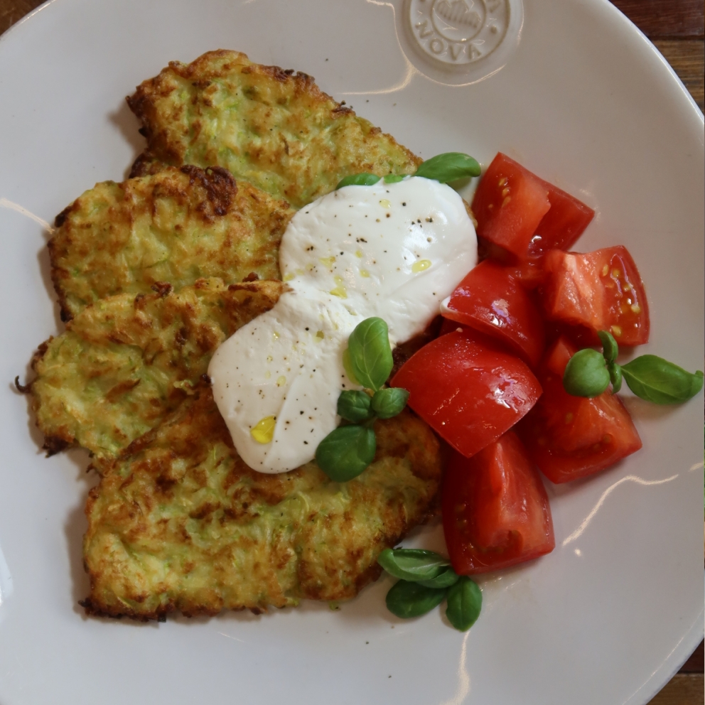 Оладьи из кабачка с розовыми узбекскими томатами и сметаной