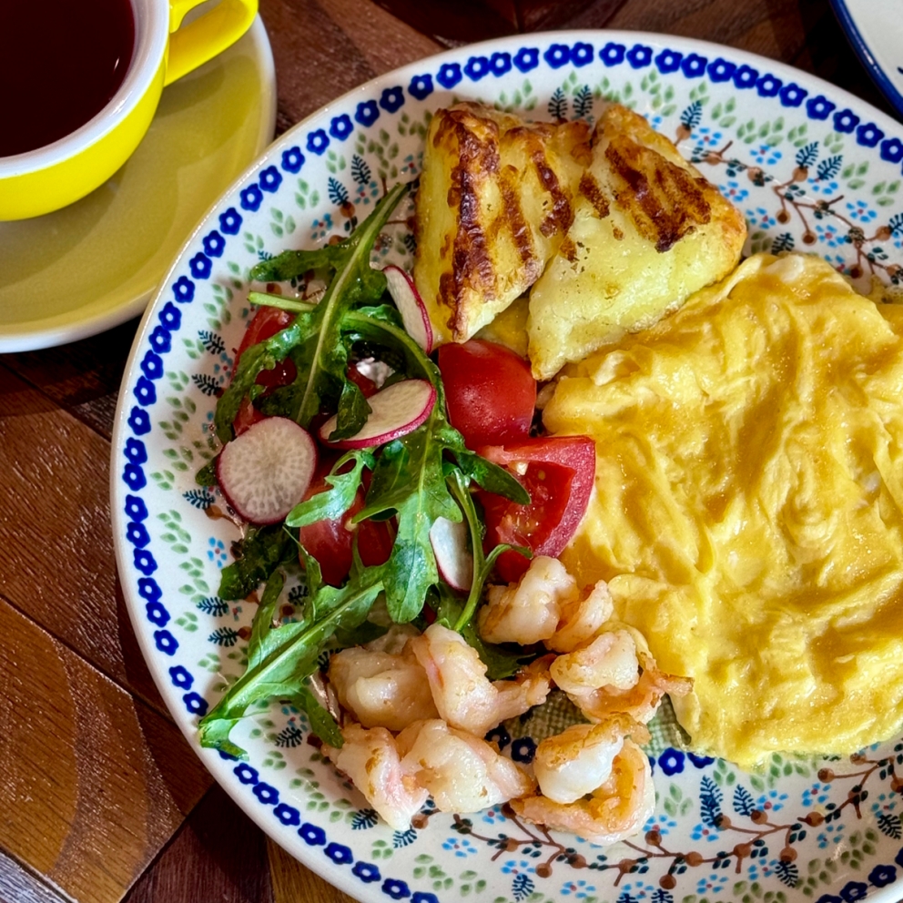 Скрэмбл из двух яиц, тигровых креветок и сыром Халлуми