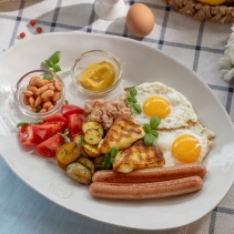 Яйцо курино, картофель, венские сосиски, бекон, розовые узбекские томаты, фасоль консервированная, томатный соус, сыр халлуми, горчичный соус, базилик