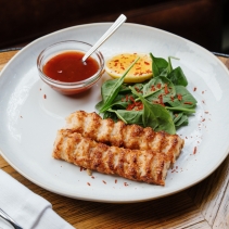 Люля-кебаб из креветок (фарш креветок, говяжий жир, лук), свежий шпинат, бланшированная спаржа, оливковое масло, соус манго-чили (сладкий чили, пюре манго), лимон