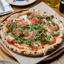 Томатный соус для пиццы (пилатти, базилик, масло оливковое), страчателла, хамон (свинина), рукола, масло оливковое, перец черный