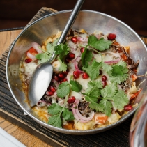 Специи (аджика, кориандр, черный перец), обжаренные очищенные баклажаны, томаты черри и болгарский перец, томленая баранина, маринованный лук, сыр сулугуни, зерна граната, кинза