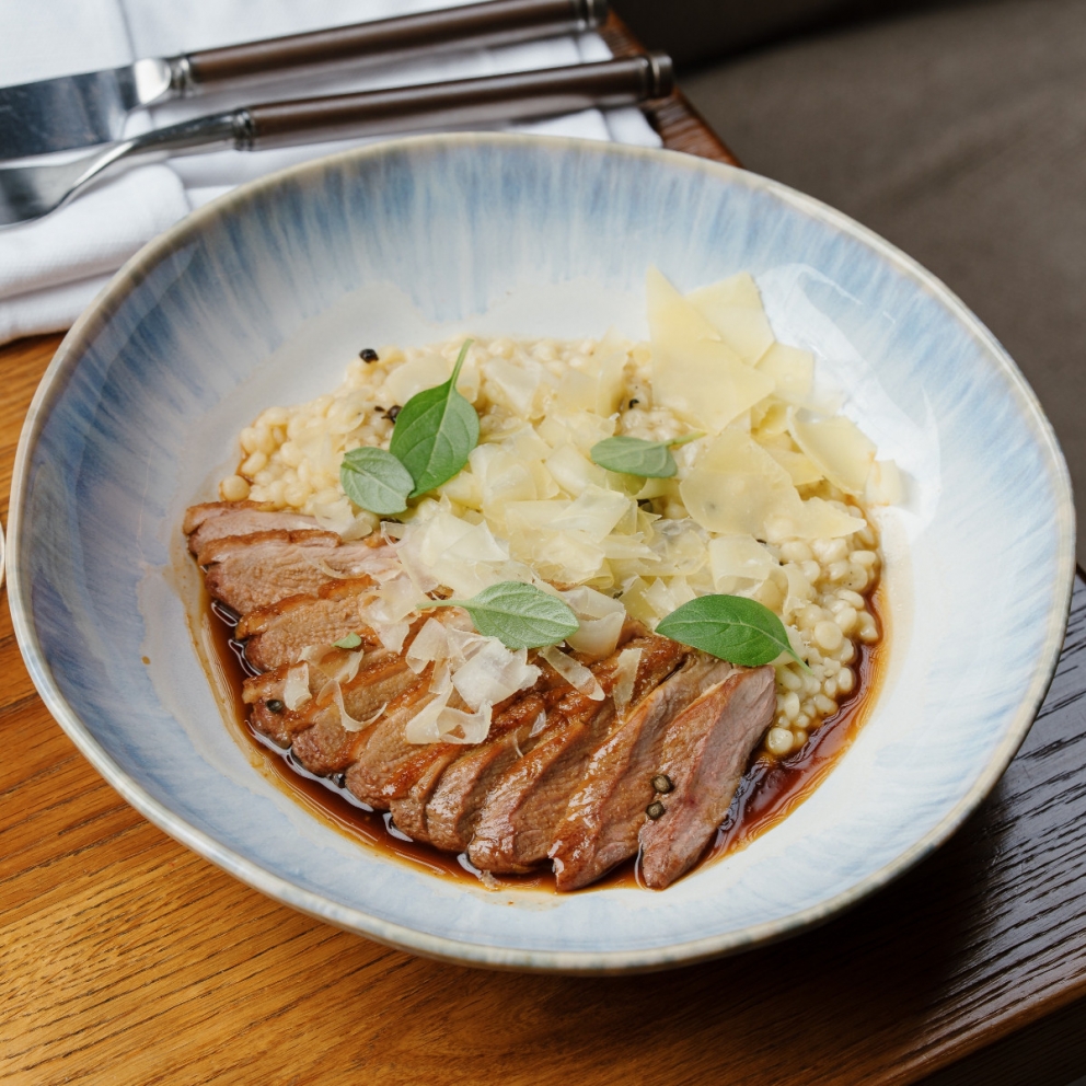 Сыр пармезан, черный молотый перец, тимьян, чеснок, соус демиглас, мандарин, коньяк, корень имбиря, утиная грудка, мед, сыр пекорино тоскано, паста птитим