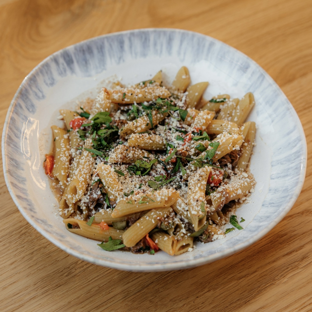 Паста домашняя, томленая грудинка говяжья, соус порто (портвейн, красный лук, тимьян, размарин, чеснок, соус демиглас, соль морская, сахар, перец черный молотый), оливки зеленые, помидоры узбекские, чеснок, сливочное масло, соль морская, черный молотый перец, масло оливковое, сыр пармезан, петрушка