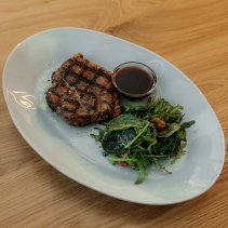 Свиная шея, аджика грузинская, базилик сушеный, чабрец сушеный, соль морская, перец черный молотый, масло сливочное, масло растительное, чеснок, соус вишневый порто (соус порто, вишневый конфитюр, куриный бульон), шпинат, руккола, помидоры черри, медово-лимонная заправка (мед, фреш лимона, соевый соус, масло оливковое)