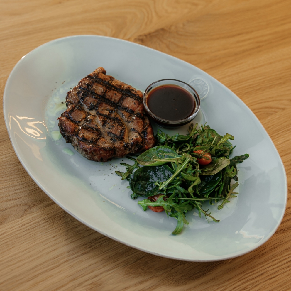 Сочный стейк в специях с салатом и вишневым соусом порто