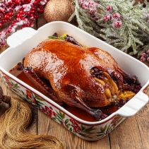 Утка запеченная (утка тушка, яблоки свежие, сок апельсиновый, соус соевый, соус терияки, мед, масло сливочное 82,5%, соль морская, бадьян, корица палочки, перец горошек душистый), апельсин, клюква вяленая, розмарин свежий