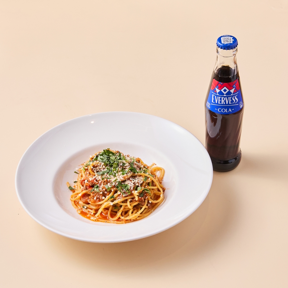Домашняя паста с соусом из рубленой говядины, специй, сыра Пармезан и напитком Эвервесс Кола 250 мл