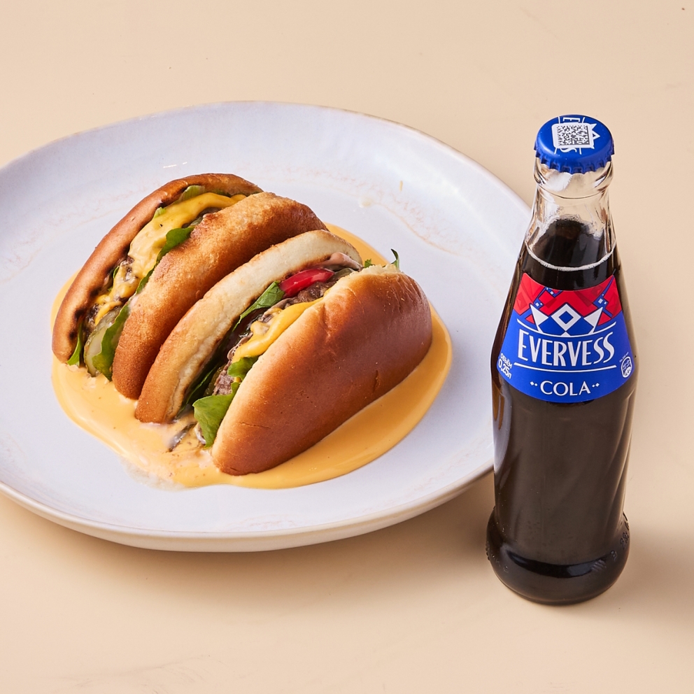 Бургер на мягкой картофельной булочке с котлетой из фарша говядины и куриного бедра, сладкими томатами, салатом романо, солеными огурцами и нежным плавленым сыром, а также напитком Эвервесс Кола 250 мл