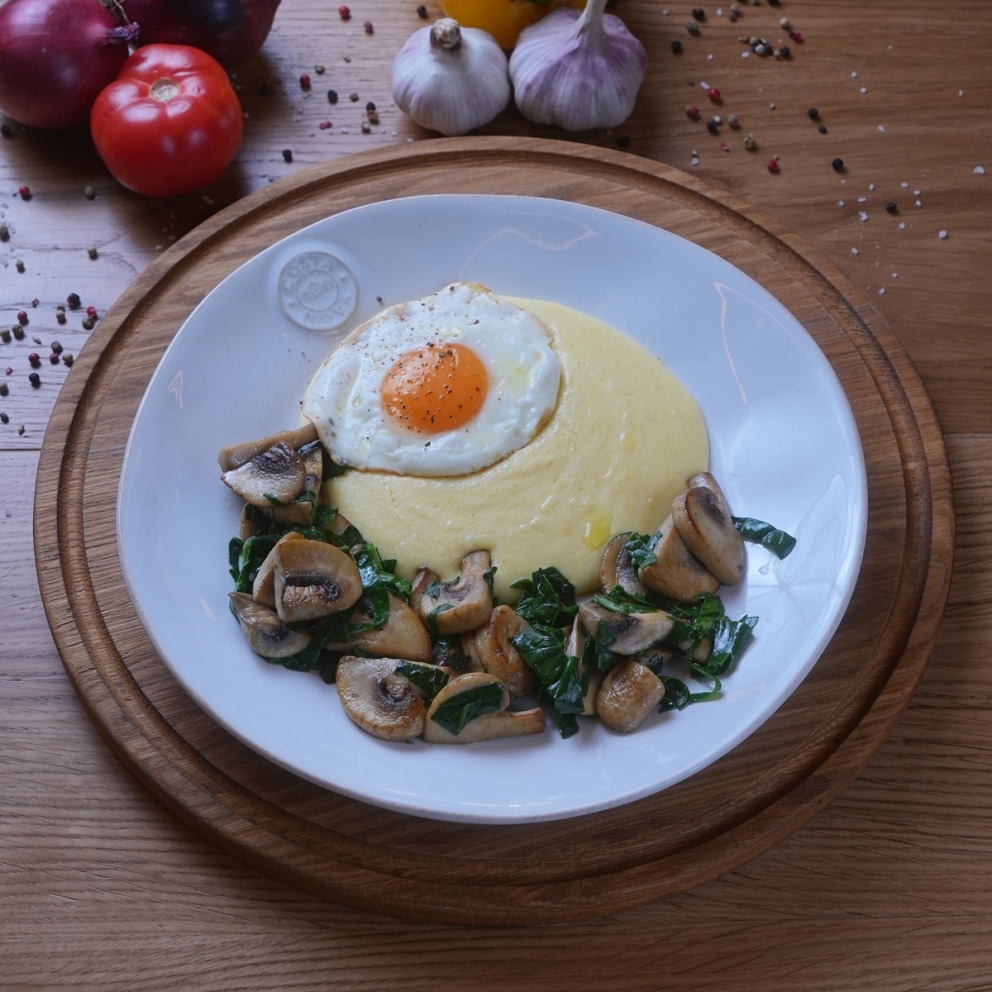 Каша из кукурузной крупы с обжаренными грибами, свежим шпинатом и яйцом всмятку