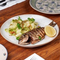 Нежная дорадо, приготовленная на углях с соусом сальса из вяленых томатов, каперсов, тимьяна и базилика. Подается с гарниром из кабачка