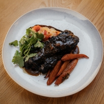 Мякоть говяжьего ребра (говяжье ребро, перец черный молотый, морковь, лук репчатый, масло растительное, пажитник, чеснок, молотый имбирь, вино, соль морская, сахар, розмарин, чабрец, паприка красная), соус терияки, бульон куриный, баклажан болоньезе (баклажан, масло растительное, соль морская, перец черный молотый, масло чесночное (чеснок, масло растительное), укроп, петрушка, кинза), сыр моцарелла, помидоры узбекские, перец болгарский запеченный, кинза, сумах, перец черный молотый, масло оливко