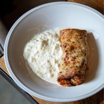 Тесто (молоко, яйца куриные, мука пшеничная, масло растительное, масло сливочное, соль, сахар), фарш мясной для блинчиков (говядина лопатка, лук репчатый, масло сливочное, масло растительное, яйцо куриное, соль, перец молотый), сыр страчателла, масло сливочное, масло оливковое