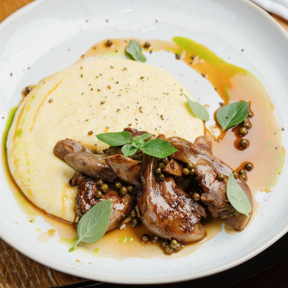 Томленые язычки ягненка, выложенные на подушку из сливочной поленты