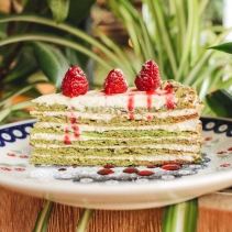 Фисташковые коржи с нежным мятным ганашем, сыром Креметте, малиновым соусом, фисташкой и свежей малиной