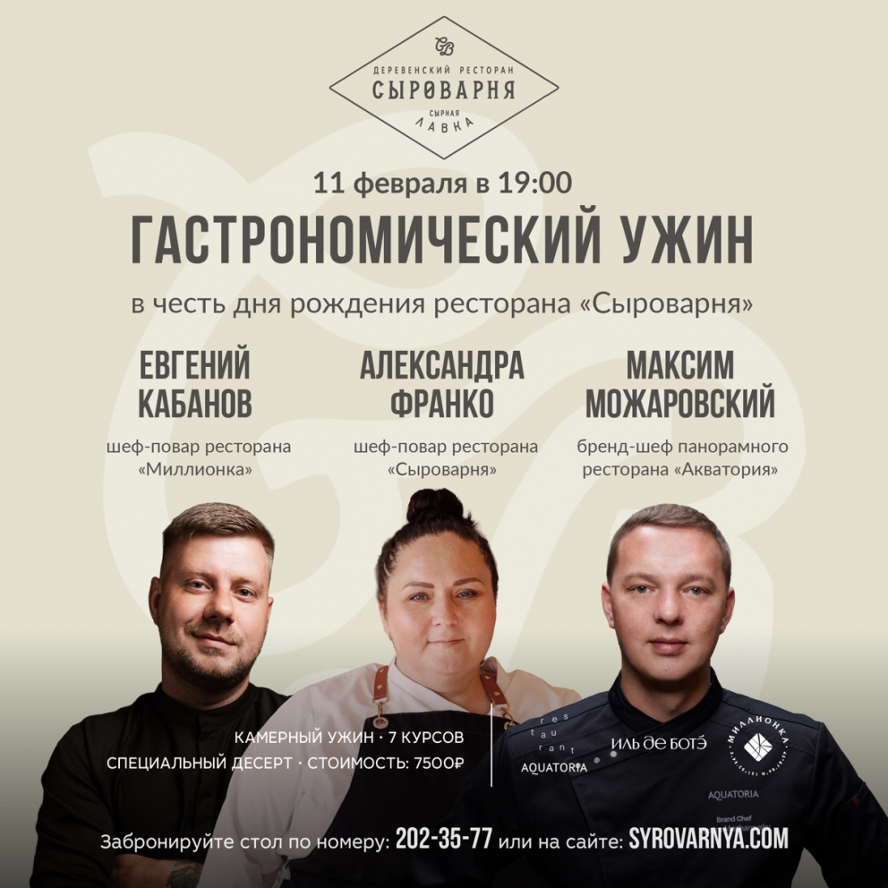 Гастрономический ужин в честь первого дня рождения «Сыроварни». 7 курсов вокруг сыра как главного продукта ресторана. В этот вечер у нашего шеф-повара Александры Франко в гостях будут друзья — бренд-шеф ресторанного комплекса «Миллионка» и бренд-шеф панорамного ресторана водного комплекса «Акватория». 11 февраля, начало в 19:00