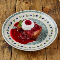 Кекс (яблоки, мука пшеничная в/с, вишня с/м, масло подсолнечное рафинированное, сахар песок, свекла, разрыхлитель для теста), соус вишневый (вишня с/м, вода питьевая, сахар песок, пектин), крем (напиток соевый со вкусом ванильного пломбира, крем на растительных маслах, сахар песок, крахмал кукурузный), мята свежая