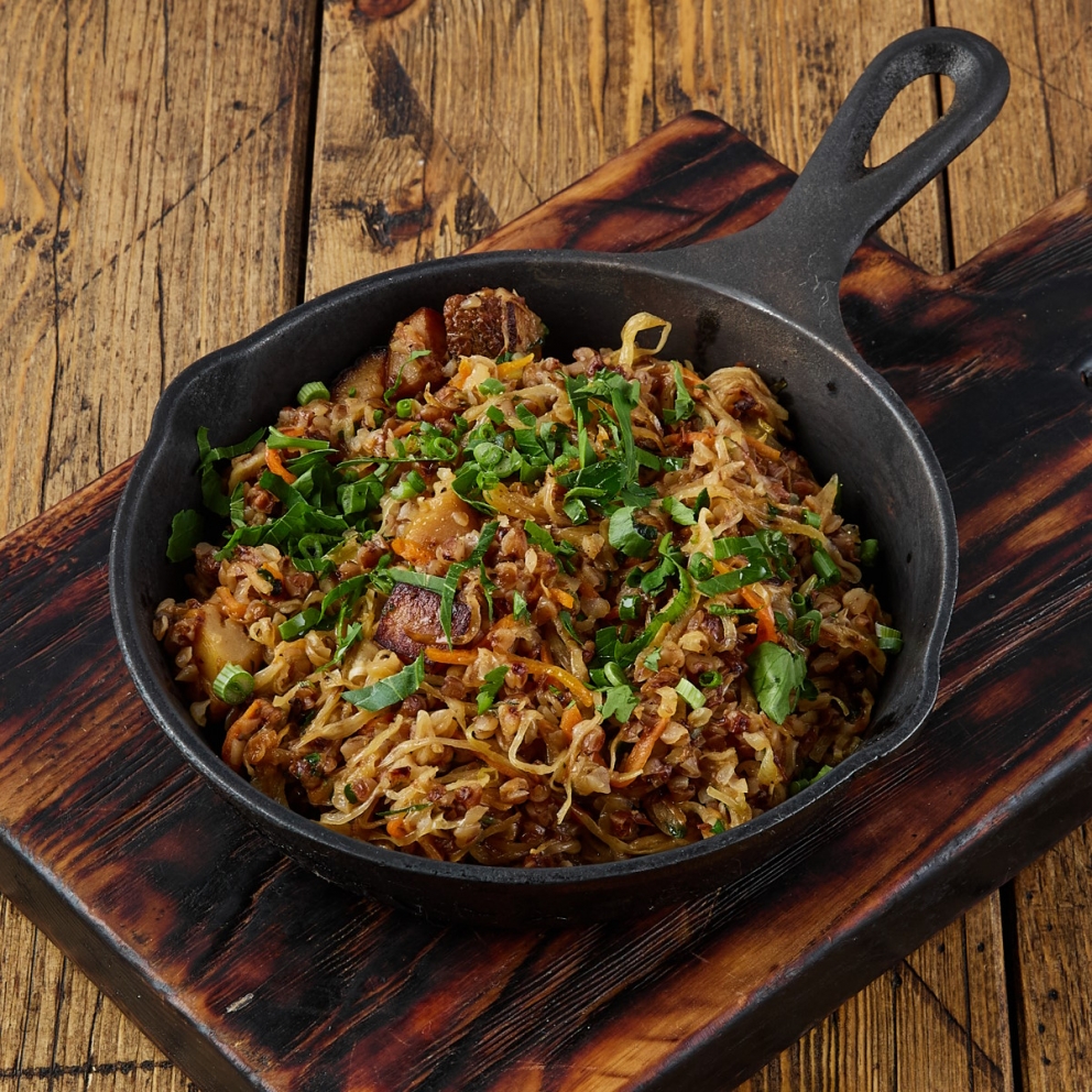 Гречневая каша, томленная с обжаренными белыми грибами, молодой капустой и овощами