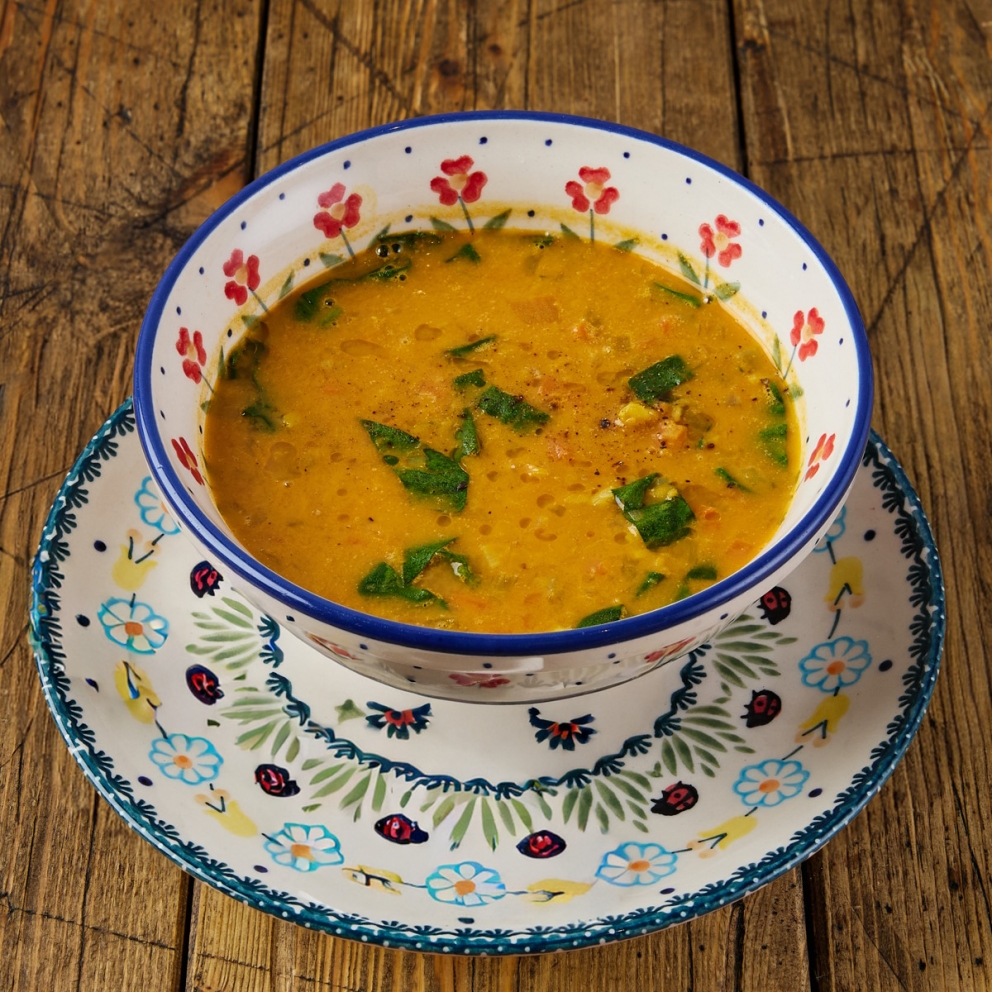 Чечевичный суп на кокосовом молоке с овощами и шпинатом