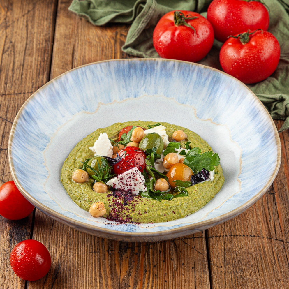 Зеленый хумус из отварного нута, соусом из шпината, пасты тахини, чеснока и специй. Подается с сыром Чанах, сочными помидорами черри, маринованными оливками, миксом свежей зелени и приправами сумах